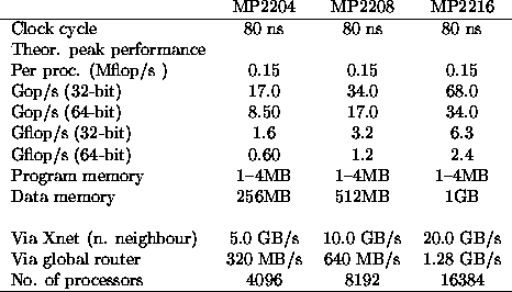 One type of interconnection of the PEs is a 2-D rectangular mesh (with wrap-around). This is however implemented by connecting the PEs diagonally via 3-way switches. As the setting of the switches only takes 1 cycle, this means that every PE can reach it 8 surrounding neighbours in 1 cycle. For more general routing schemes a Global Router is available. This acts, in principle, as a three-stage crossbar. PEs are arranged in clusters of 4 X 4, which connect to other clusters through the first level of the crossbar. All clusters connect via an intermediate stage to the target stage (again at cluster level). The ports from the clusters are multiplexed to the individual PEs within a cluster. As this type of communication is fairly intricate, it is much slower than via the Xnet (see system parameter list above).