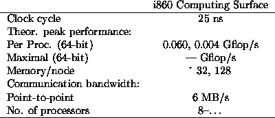 The i860 Computing Surface is a hetergenous processor machine. It uses i860, SPARC, and Inmos T800 processors in one system. Other processors could in principle be added. Although the T800s can be used for computation, they usually will be used as communication engines between processor boards. The Computing Surface system needs at least one SPARC processor which acts as a host. Furthermore, boards can be put in system cabinets (either for 10 or for 40 boards) that each contain 2 i860 processors, two T800s (called Network Interface Processors in this context), 64 KB of on-board cache and up to 32 MB of memory per board. The Computing Surface Network has another 2 MB of buffer memory on board. Meiko contends that any mix of the three types of boards can be configured and no upper limit for configurations is given. Therefore, no peak performance is given in the list above.