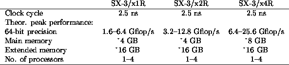 The many model numbers deserve some explanation: suffix /xy stands for the number of processors x and the number of vector pipe sets y, respectively. In this terminology the largest SX-2 would have been a SX-2/14R because it has four pipe sets. With the new generation of SX-3s multiple processors were introduced. Because a pipe set under the right circumstances can produce four results per clock cycle at a cycle time of 2.5 ns, the theoretical peak speed is 1.6 Gflop/s per pipe set which leads to the quoted performances in the system parameters list. Although the clock cycle for the scalar processor is identical to that of the VPUs, an instruction only can be issued every two cycles, so effectively the situation is not very different from that of the other Japanese vectorprocessors where the scalar unit has a clock rate of twice that of the VPUs.