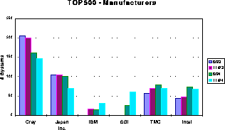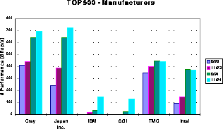 Looking at the distribution of the different manufacturers in Fig. 4, we see a decreasing share of Cray Research and of the Japanese vendors, while the market share of IBM and even more of SGI rose quite significantly during the last year. The traditional MPP manufacturers TMC and Intel seem to have reached a stagnation point. In the case of TMC, this certainly is true as they had to stop the hardware production. Looking at the changes in the accumulated performances of the different vendors in Fig. 5, we see that the installed performance of the Japanese vendors is increasing strongly. This is another indication that during the last two years larger systems were installed in Japan than anywhere else.
