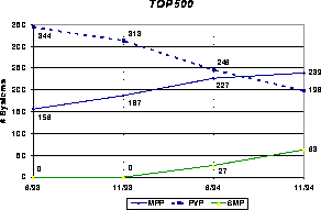 In 1993 the parallel vector processors (PVP) clearly dominated the TOP500 . As can be seen in Fig. 6, 60% to 70% of the installed systems came from this class. Only up to 37% of the systems came from the class of massively parallel processor systems (MPP). In 1994 this situation changed drastically. At the end of 1994 for the first time the PVP systems were no longer the dominating architecture in the TOP500 . Their share decreased to 40%, while the share of MPP systems ros e to 48%. MPP systems are now the dominating class of systems in the TOP500 . Additionally a new class of architectures entered the TOP500 in 1994: the class of symmetrical multiprocessor workstations (SMP). While those systems were not present in the 1993 lists, we now have a very strong rising share with already 13% of all systems coming from this class.