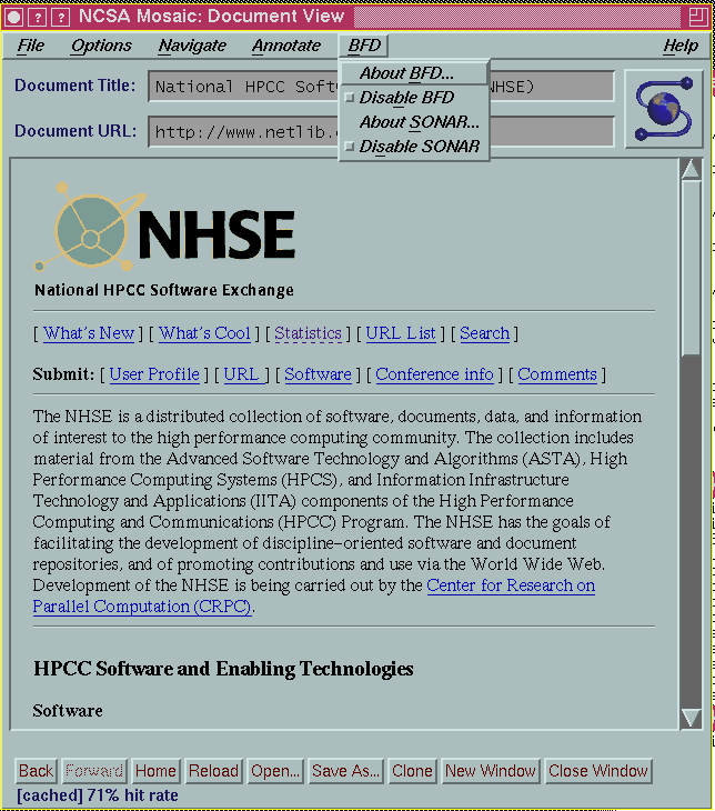 A client library that may be linked with WWW browsers has been written using code generated by Suns's rpcgen program. The client library is being re-written in raw C for better portability, efficiency, and flexibility in a multiple server environment, and will soon be made publicly available. A screen shot of the BFD client is shown in Figure 4.
